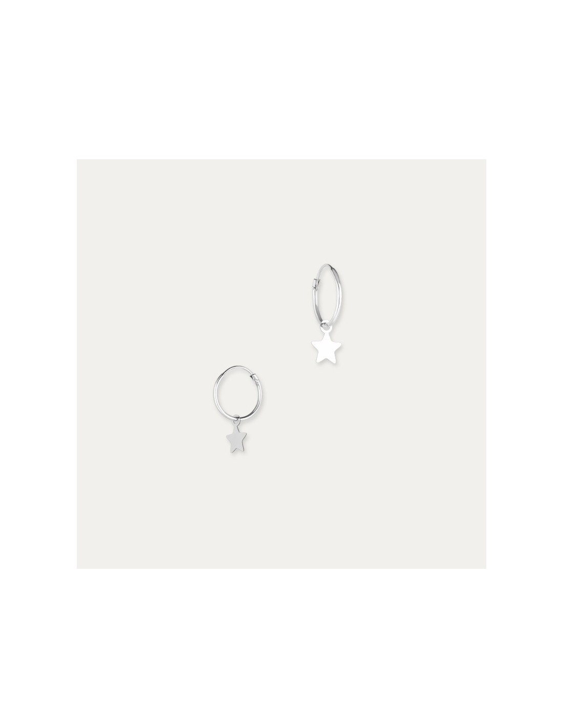 Pareja de pendientes fabricados en Plata de Primera Ley con un aro del que cuelga una pequeña estrella. Unos pendientes perfectos para mujer y niña por igual.