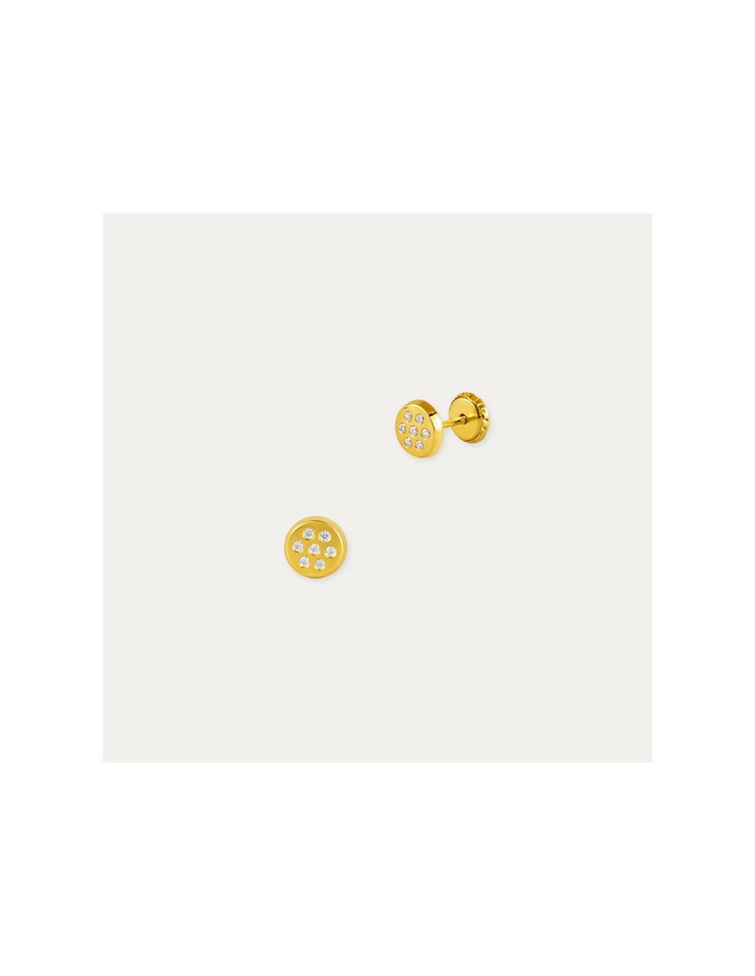 Par de pendientes fabricados en Oro de 18 kilates con siete circonitas en gastadas en un disco, todo ello con un cierre de tornillería que aporta seguridad.