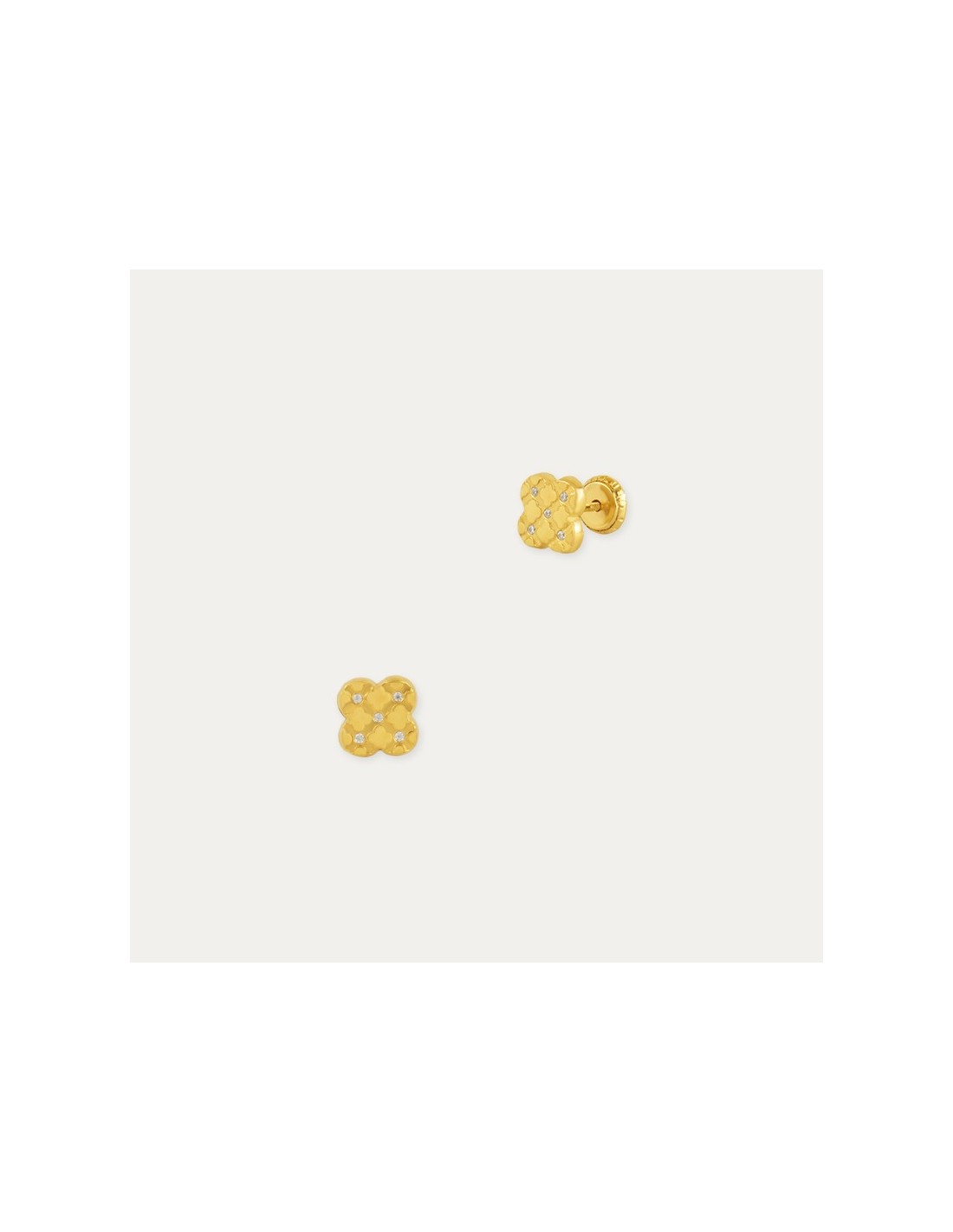 Par de pendientes infantiles en Oro de 18 kilates con forma de flor de cuatro pétalos y decorados con circonitas.