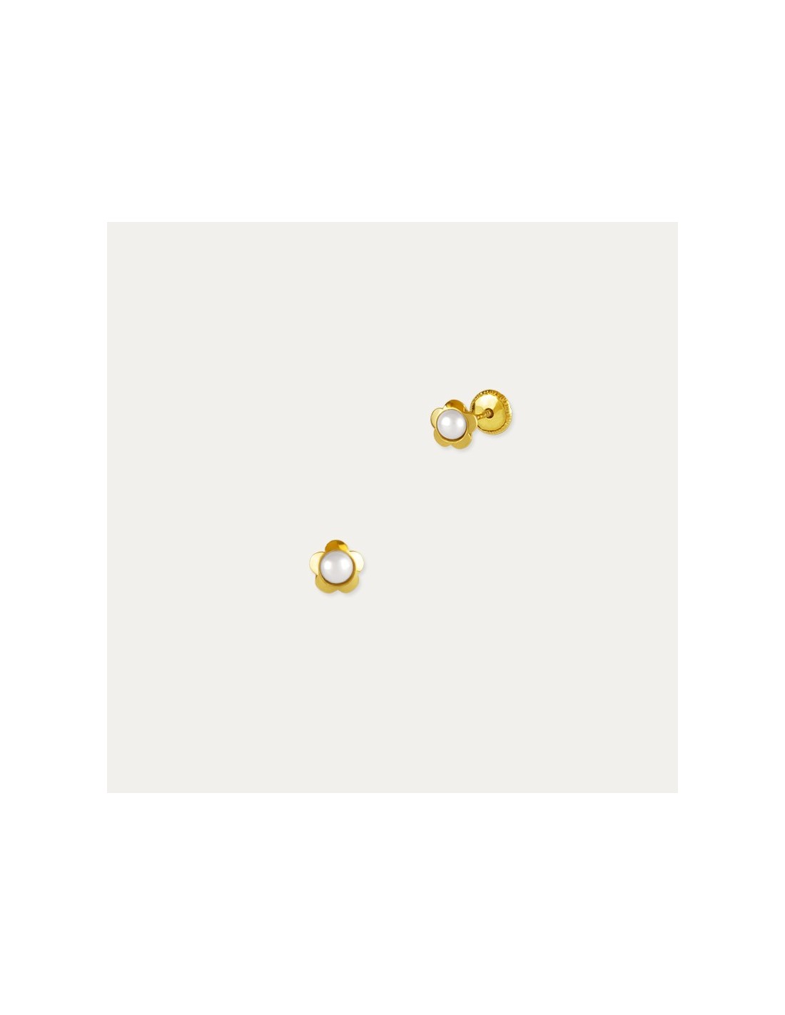 Pareja de pendientes para niña, fabricados en Oro de 18 kilates en forma de flor y con una perla central, llevan un cierre de tuerca para mayor seguridad.