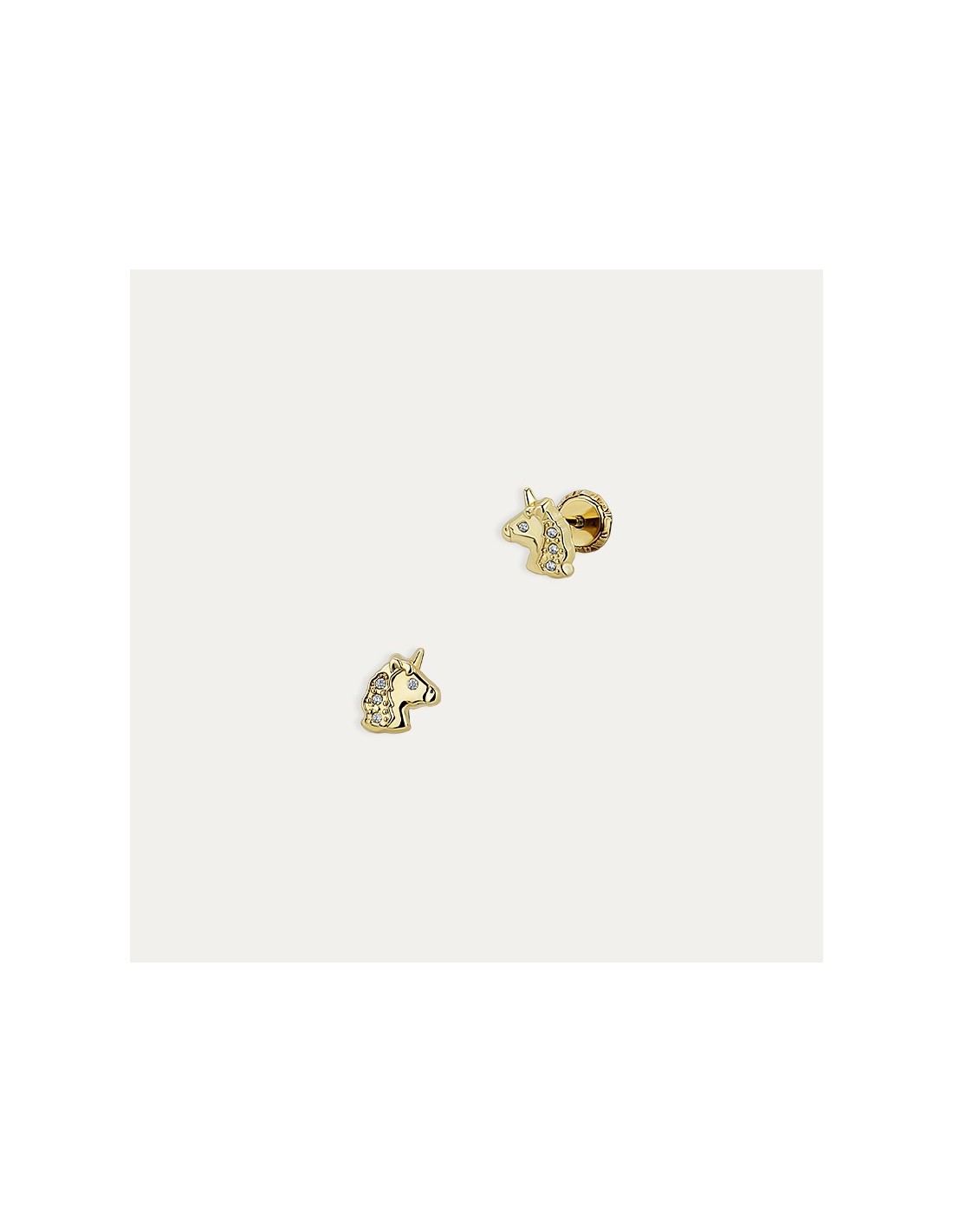 Par de pendientes infantiles fabricados en Oro de 9 kialates con motivo de unicornio y detalles de circonitas. Lleva un cierre de estilo tuerca para facilitar su fijación.