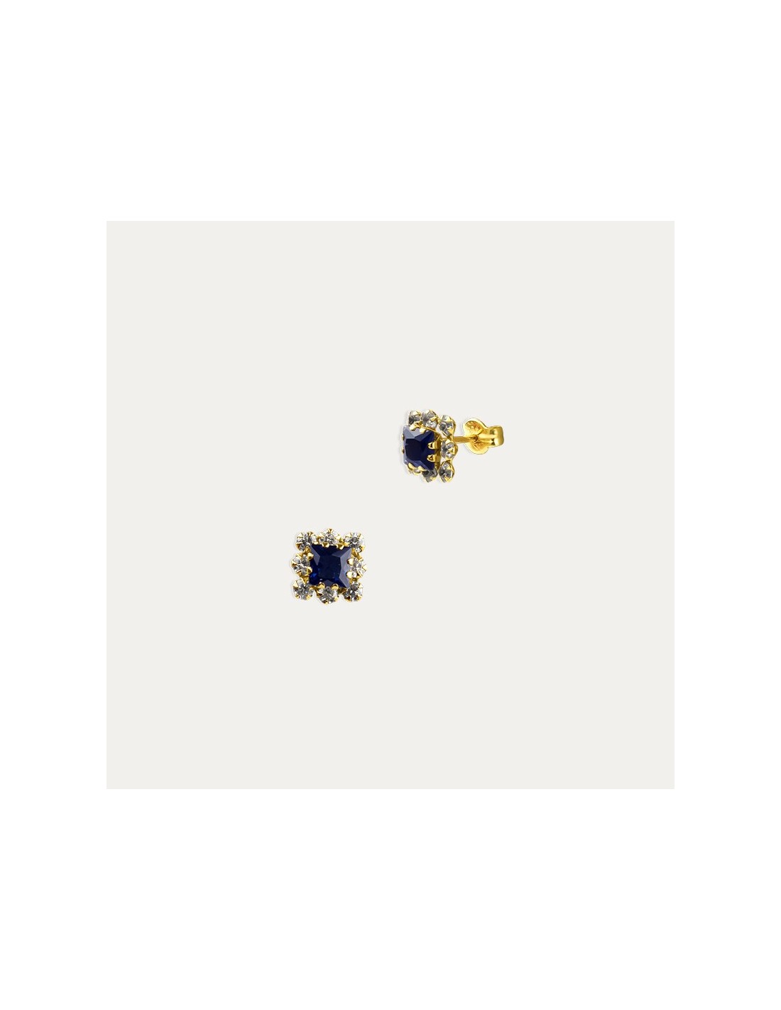 Par de pendientes de Oro de 9 kilates con una piedra de color zafiro rodeada de circonitas dándoles forma cuadrada.