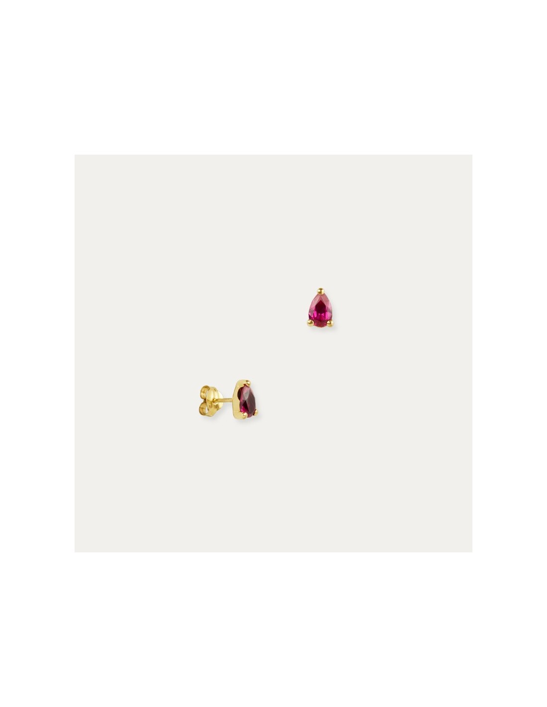 Pareja de pendientes fabricados en Oro de 9 kilates con una piedra de color rubí en talla de lagrima y tres garras. Estos pendientes llevan un cierre de presión muy cómodo.