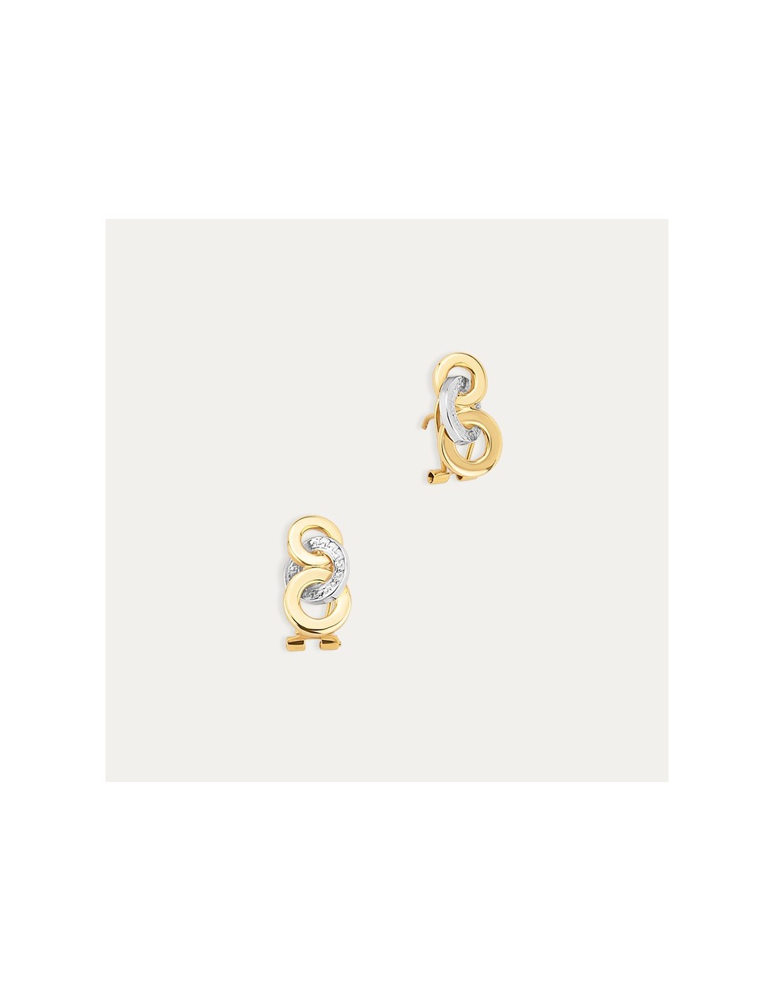 Pareja de pendientes elaborados en Oro de 9 kilates bicolor con motivo de tres círculos entrelazados, llevan un circulo en blanco con textura de greca y el resto van en acabado brillo.