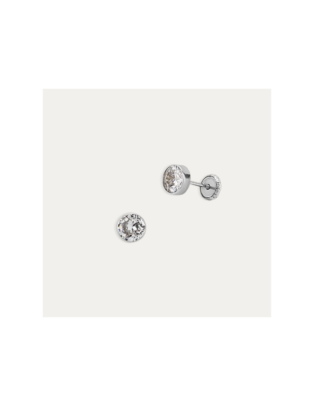 Pareja de pendientes fabricados en Oro de 9 kilates blanco tipo chatón con circonita. Gracias a su cierre tipo tuerca facilita su uso y sujeción.
