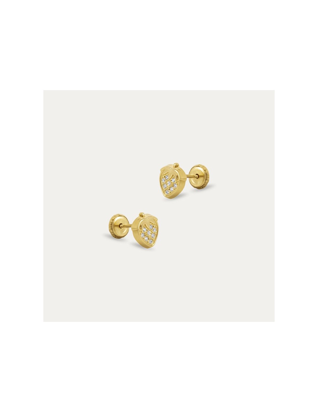 Pendientes de aro en Oro 9K. Pequeños pendientes para comunión con motivo de fresa con pequeñas circonitas y cierre de rosca.