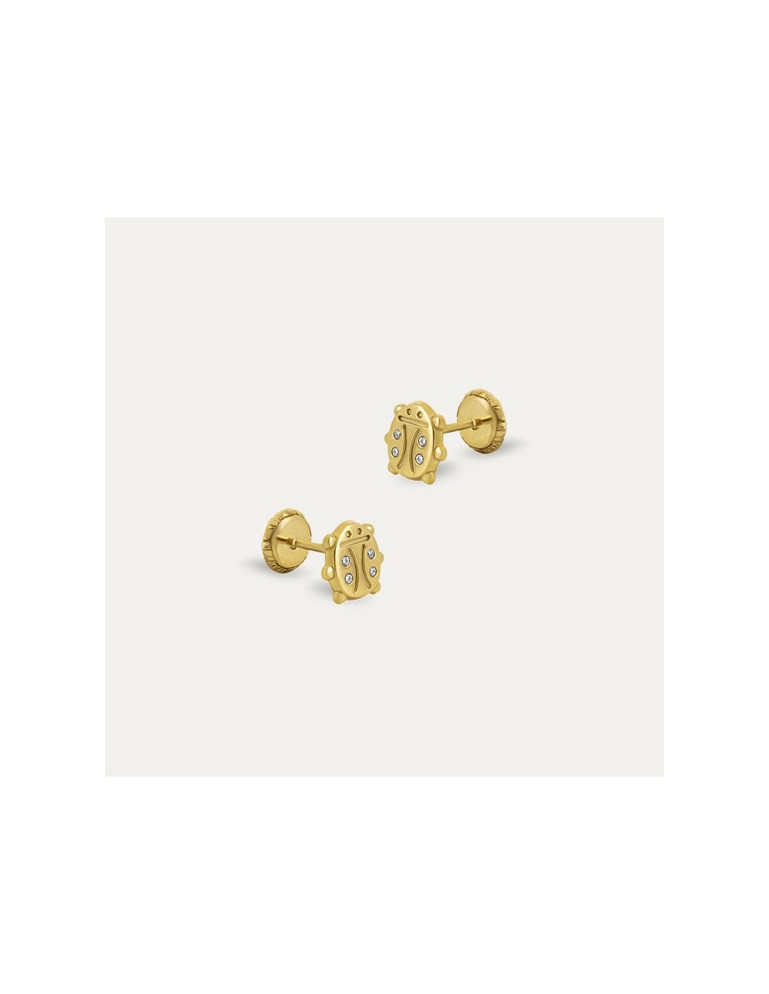Pendientes de aro en Oro 9K. Pendientes con motivo de mariquita con cuatro pequeñas circonitas y cierre de rosca, perfectos para la primera comunión.