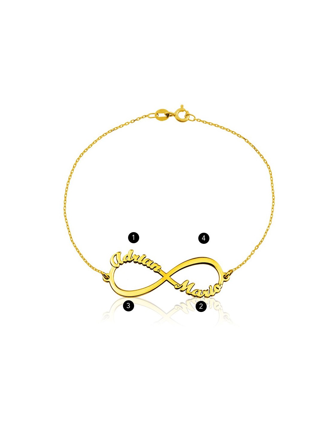 Pulsera con motivo infinito en oro 9k. Personaliza hasta 4 nombres, el regalo perfecto para toda ocasión.
