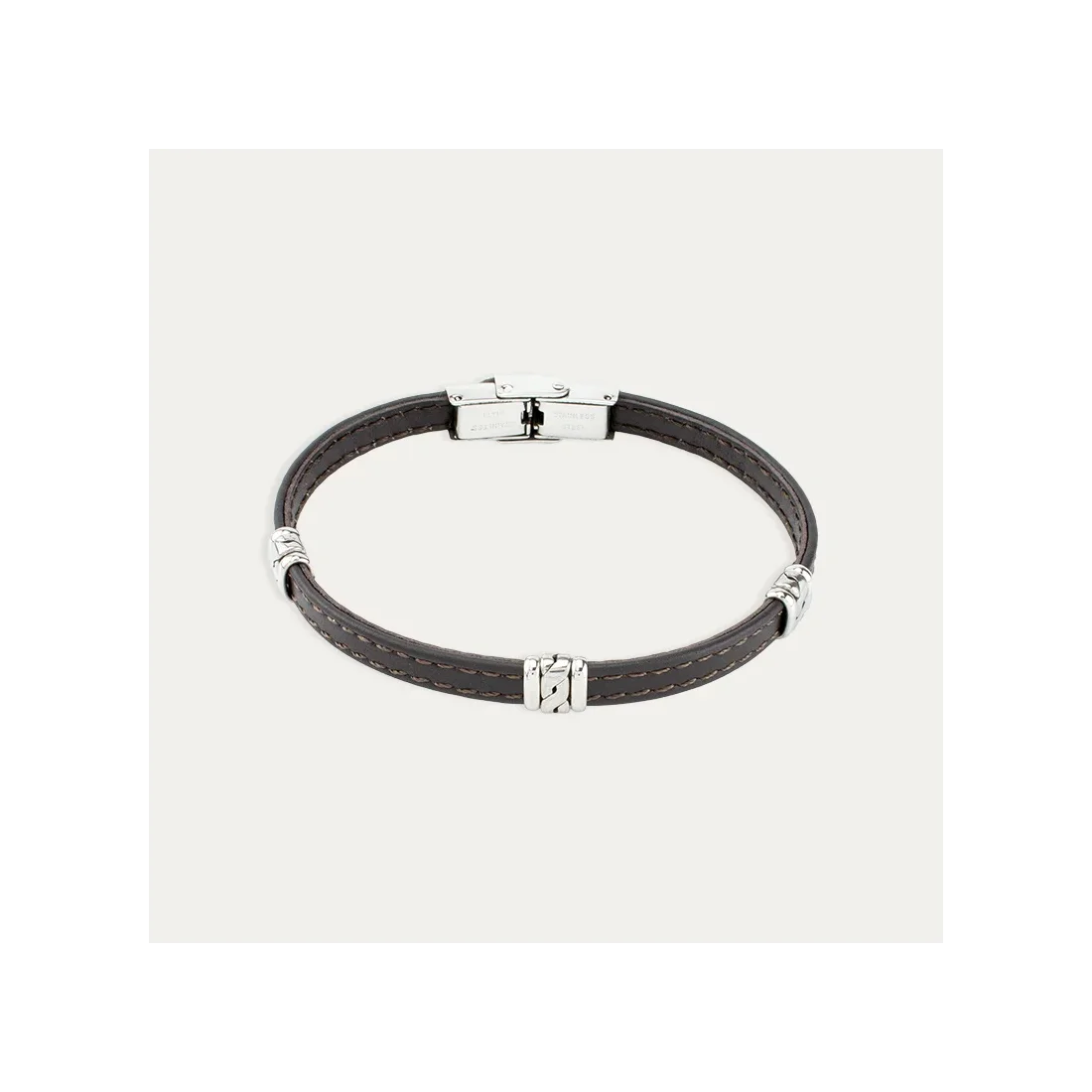 Pulsera de cuero marrón con detalles de eslabón de acero y costuras laterales en hilo marrón.