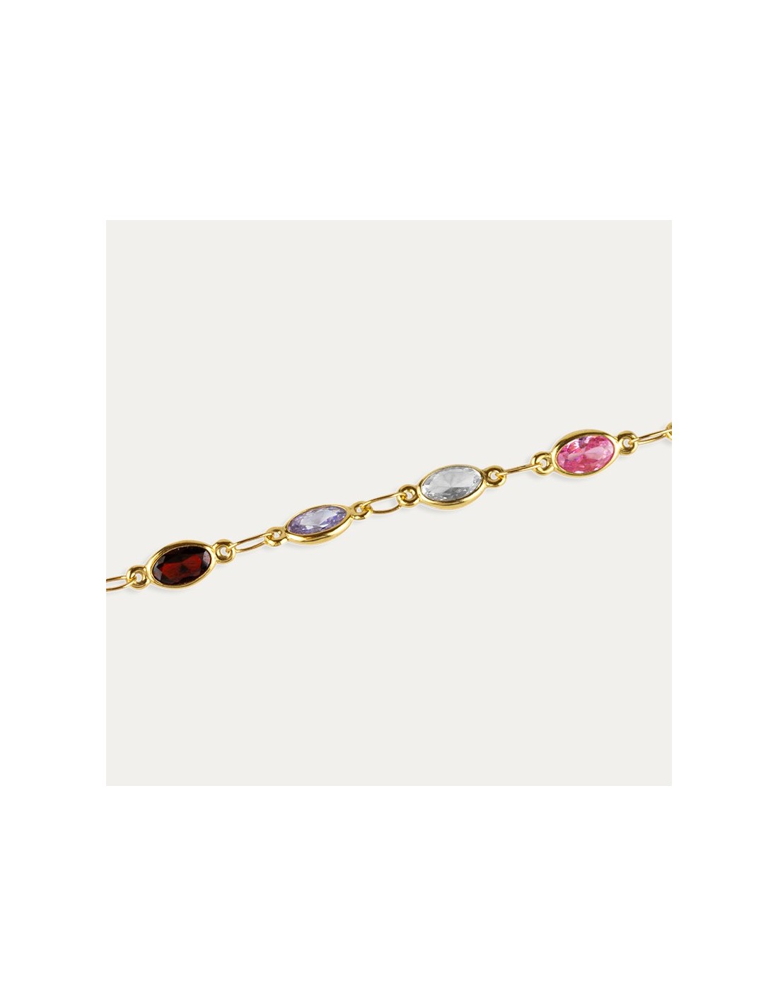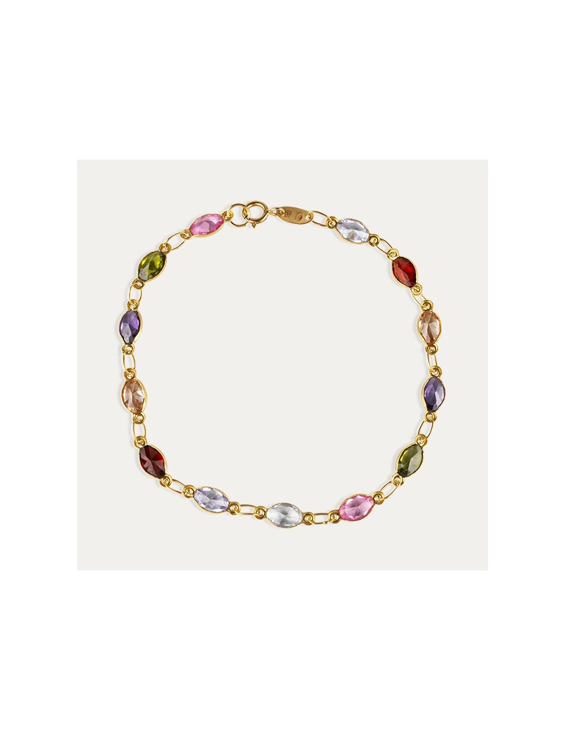 Pulsera fabricada en Oro de 18 kilates con abalorios de piedras de colores engastados a modo de eslabón. Una joya colorida y llamativa.