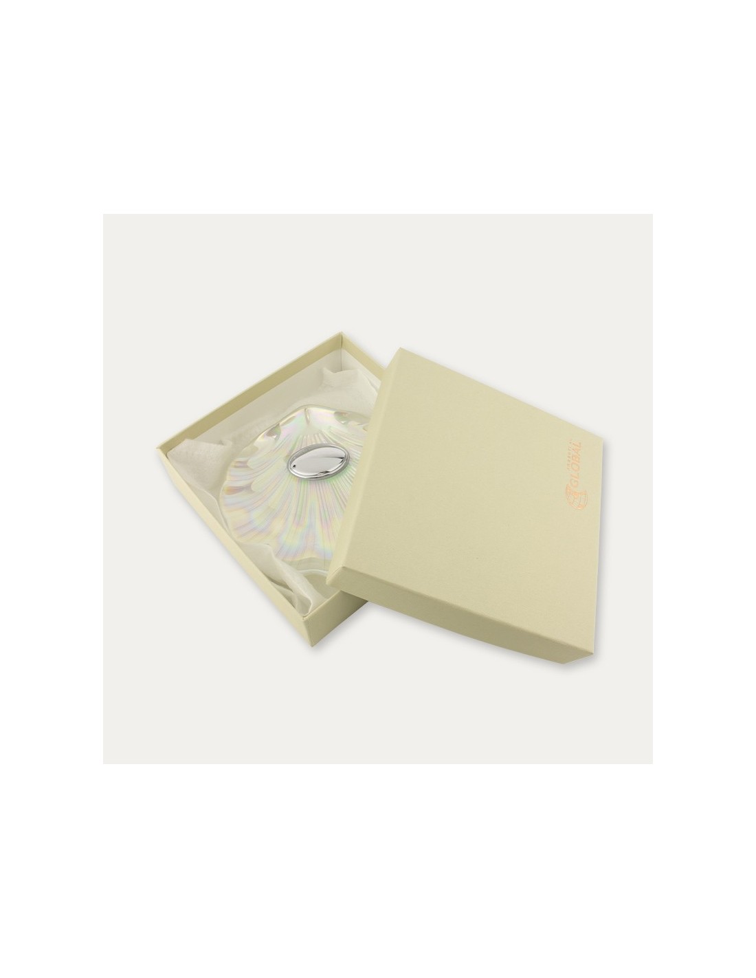 Concha bautismal de cristal con efecto nácar y una chapa en plata bilaminada que admite grabación