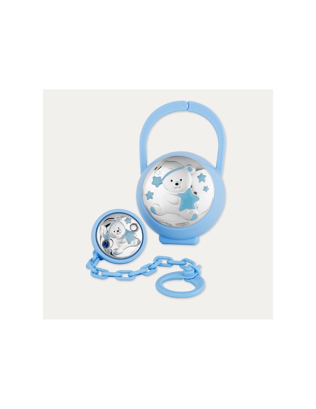 Chupetero + Portachupetes Plata Osito Azul Funny