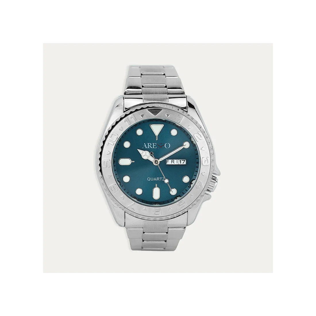 Reloj para caballero de acero con esfera en color aguamarina. Cuenta con un bisel giratorio y calendario.