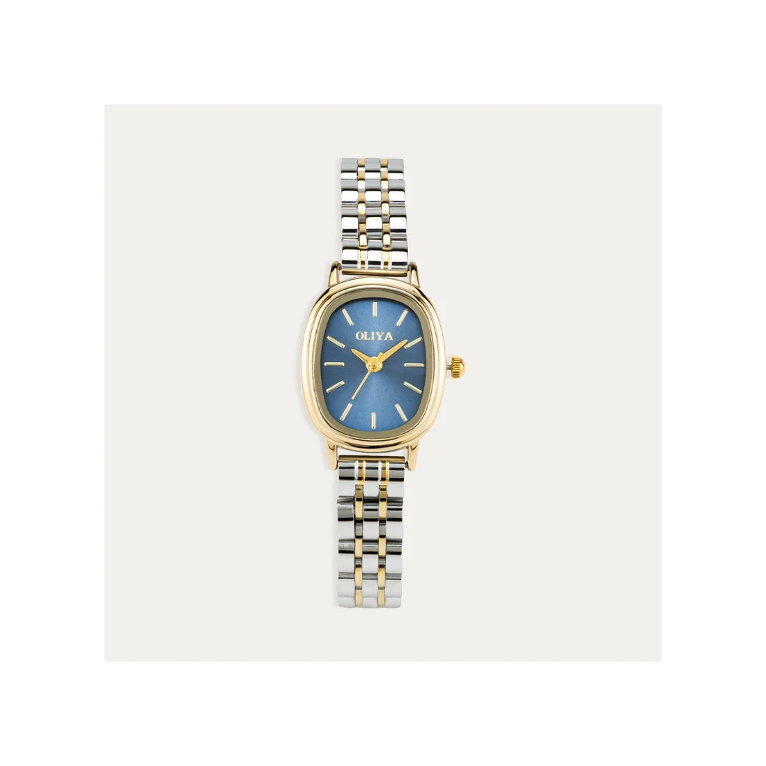 Colección Ophelia, gama de 4 relojes de acero para mujer. Este, fabricado en acero bicolor con la esfera en color azul degradado.