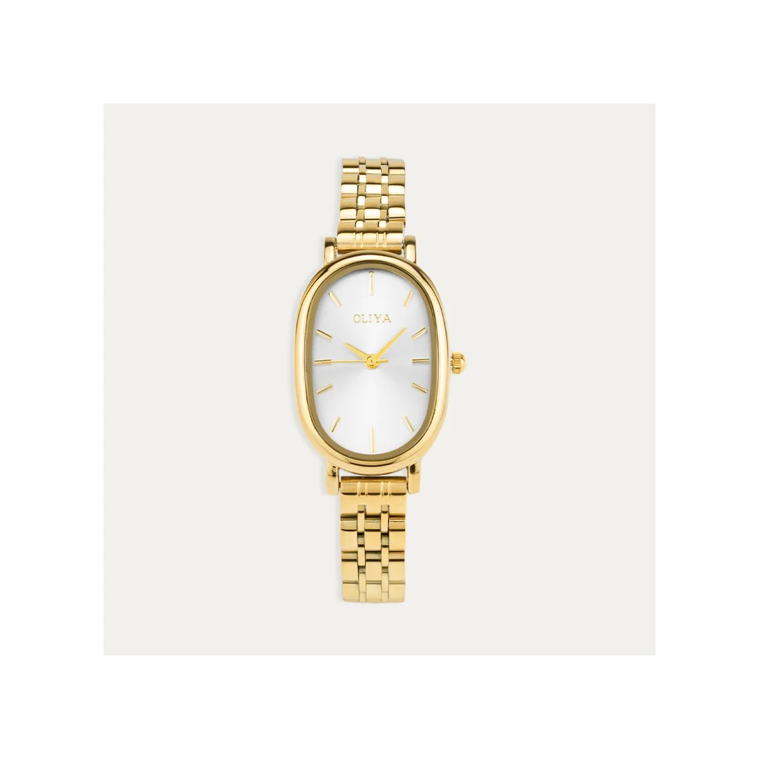 Reloj atemporal, fabricado en acero dorado, con la esfera ovalada en color blanco. Ideal para las ocasiones especiales.