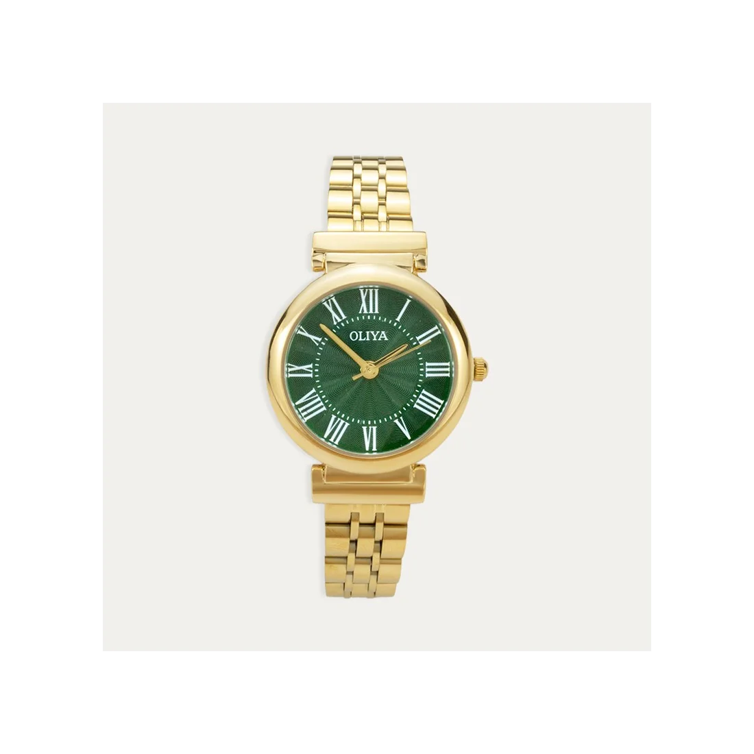 Reloj de acero amarillo con esfera en tono verde. Un enfoque clásico y minimalista para darle un toque diferente a tus looks.
