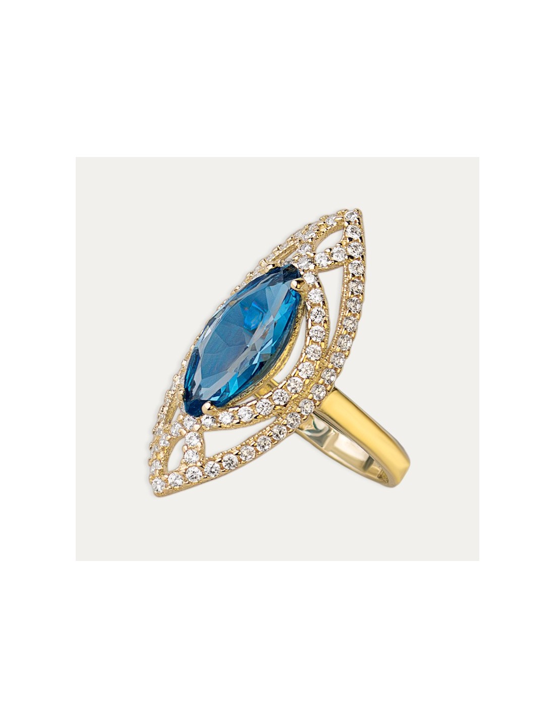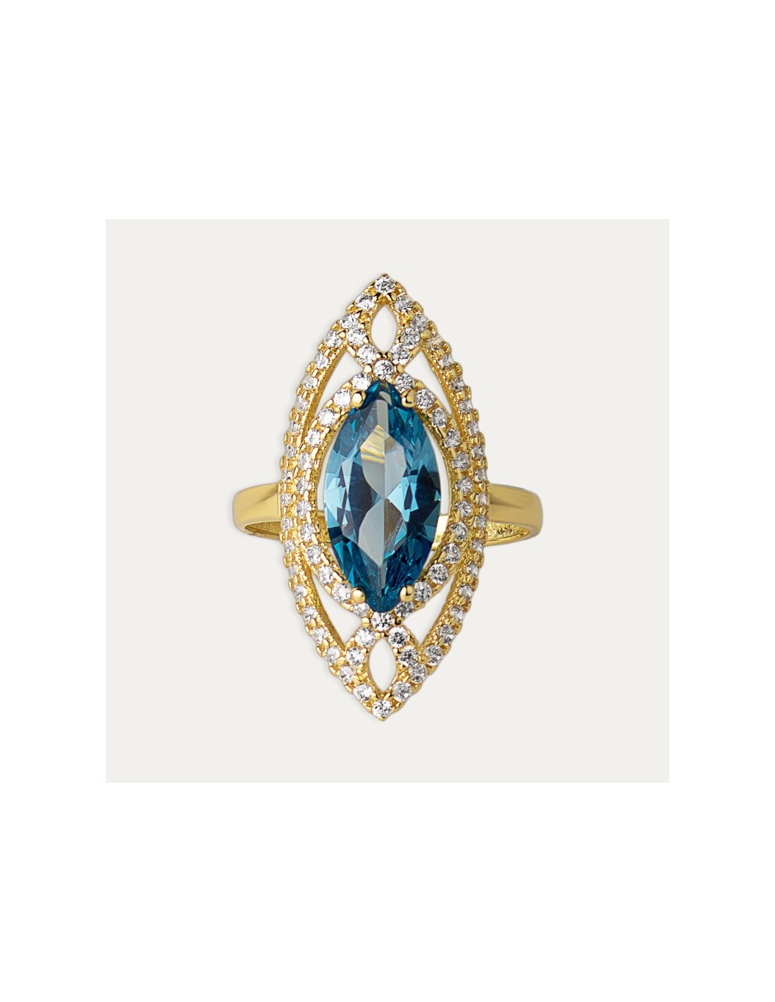 Sortija fabricada en Oro de 9 kilates con una piedra central en color agua marina y de gran tamaño en talla marquise, rodeada de circonitas por todo el motivo.