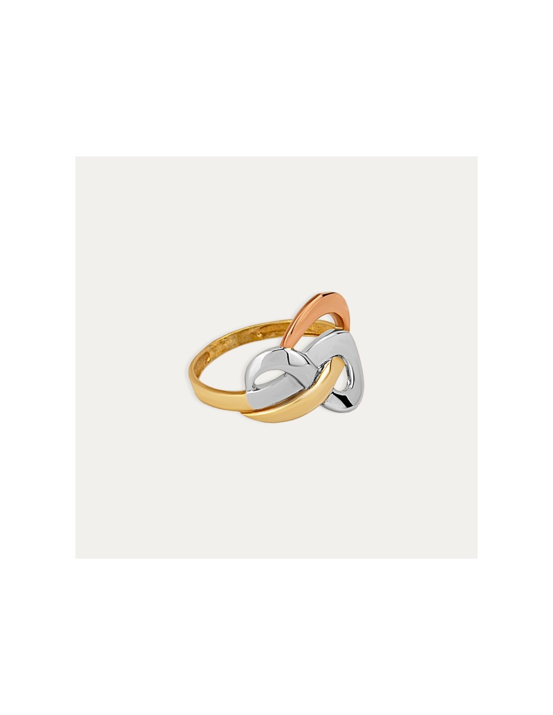 Sortija de oro tricolor de 9 quilates con un diseño entrelazado, una bonita joya para combinar.
