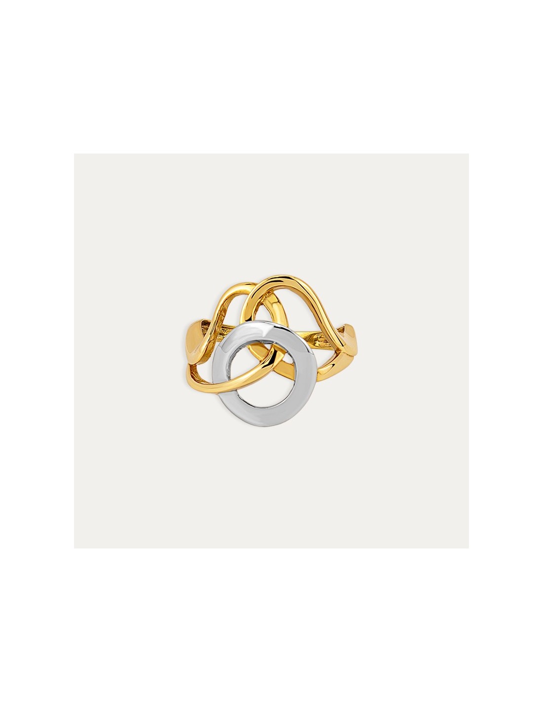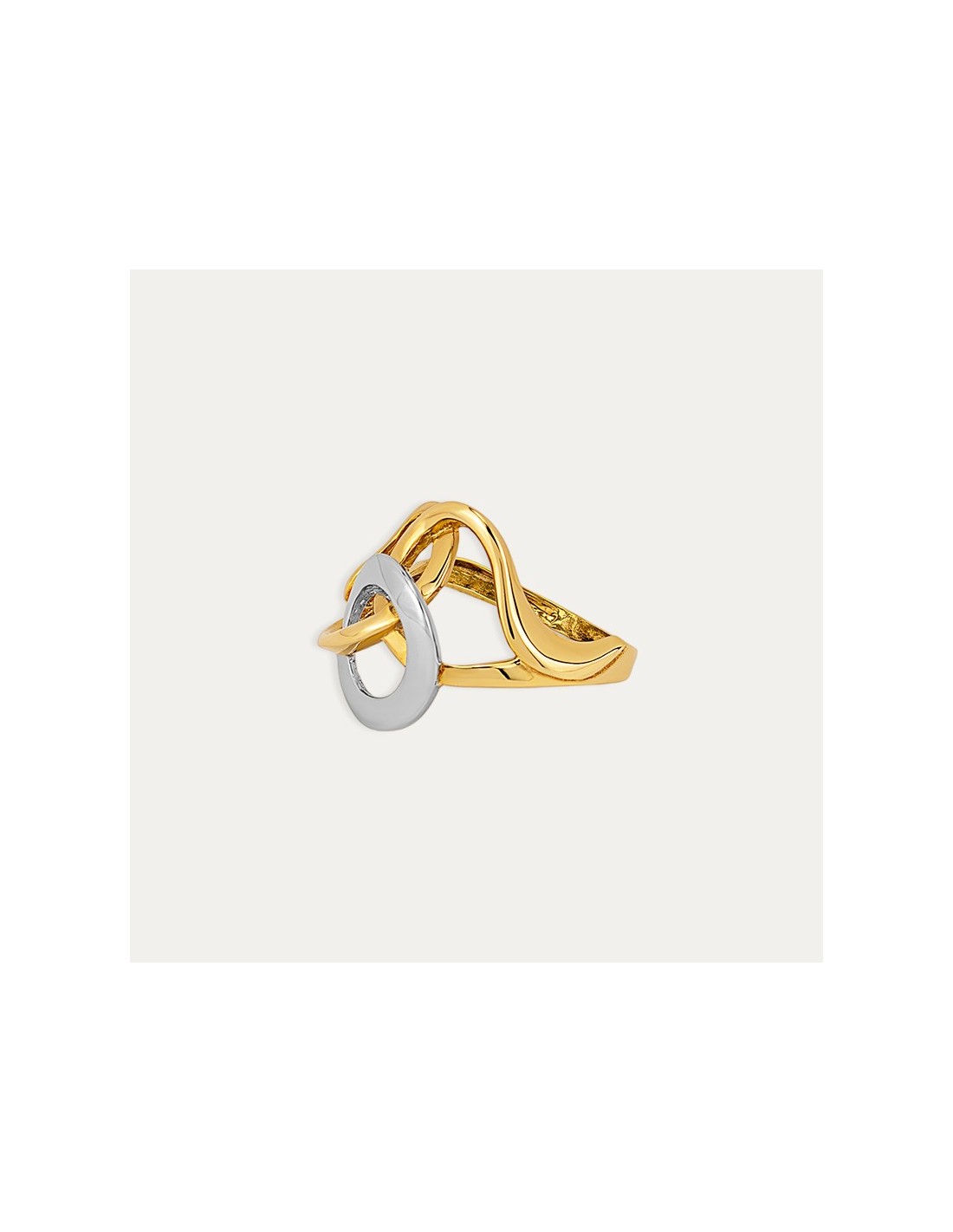 Sortija abstracta de oro bicolor de 18 quilates. Una joya perfecta para las ocasiones especiales.