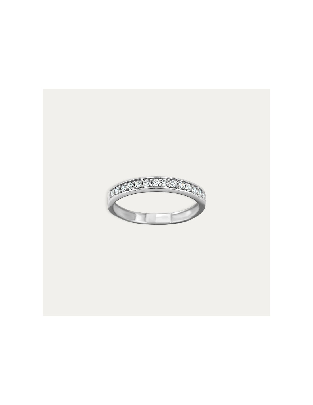 Sortija fabricada en Oro de 9 kilates blanco en motivo de carril con circonitas engastadas. Una joya clásica y elegante que la transforma en una pieza versátil y atemporal.
