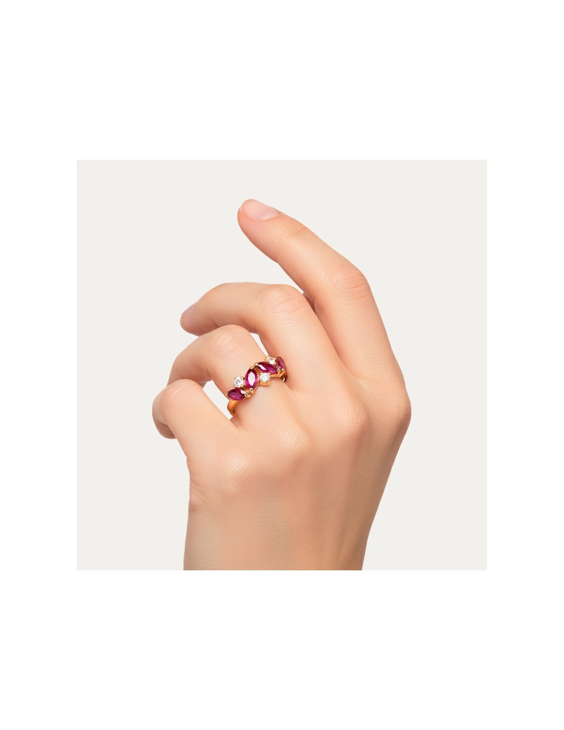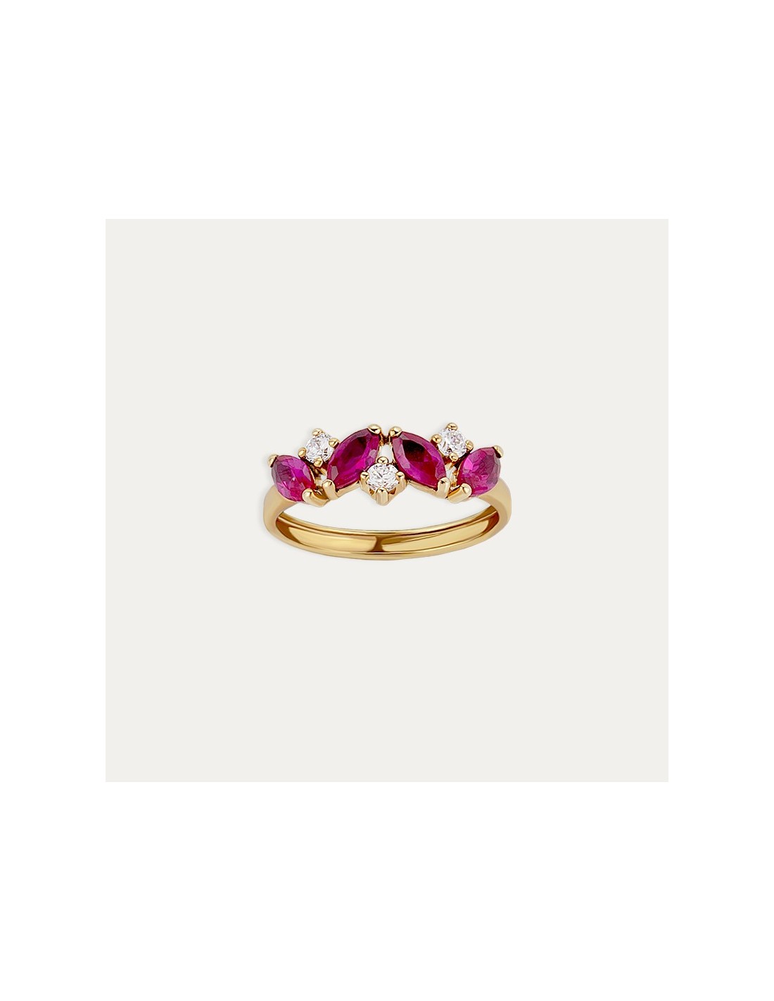 Sortija elaborada en Oro de 9 kilates con piedras de color rubí en talla marquesa y circonitas. Una joya elegante que aporta color y delicadeza a tu conjunto.