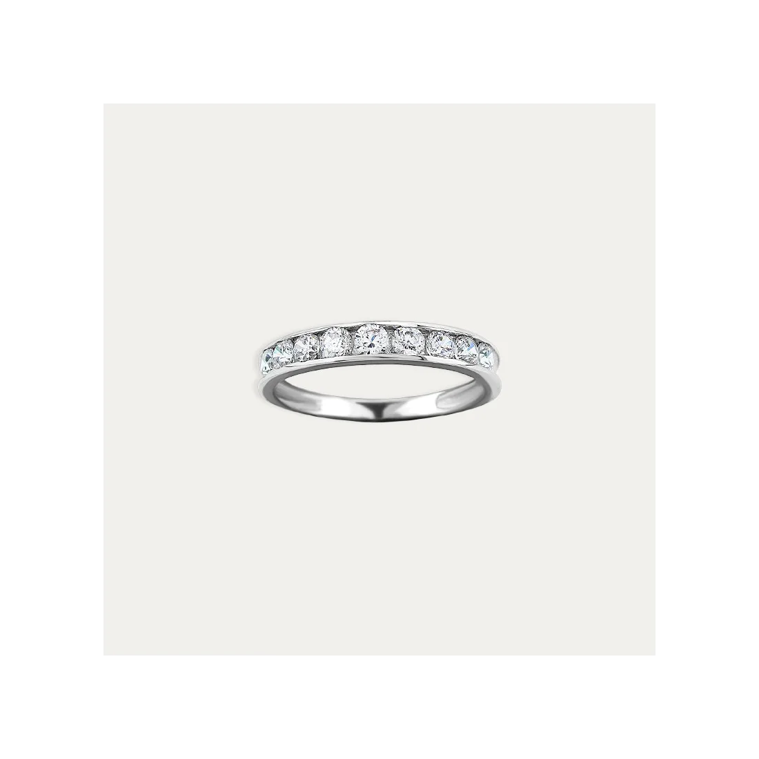 Sortija de motivo carril con nueve circonitas, fabricada en Oro blanco de 18 kilates. Una joya clásica, atemporal y elegante.