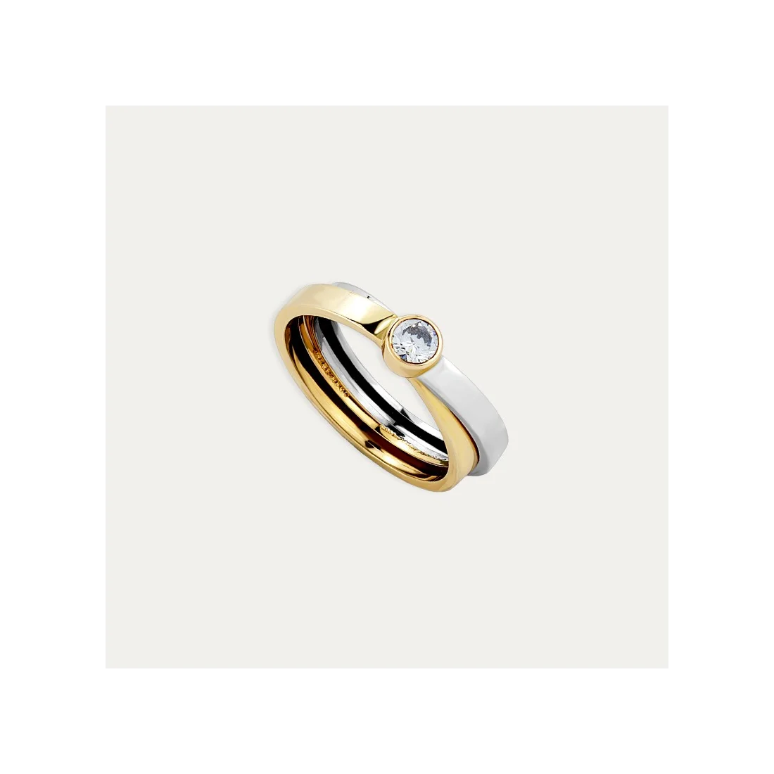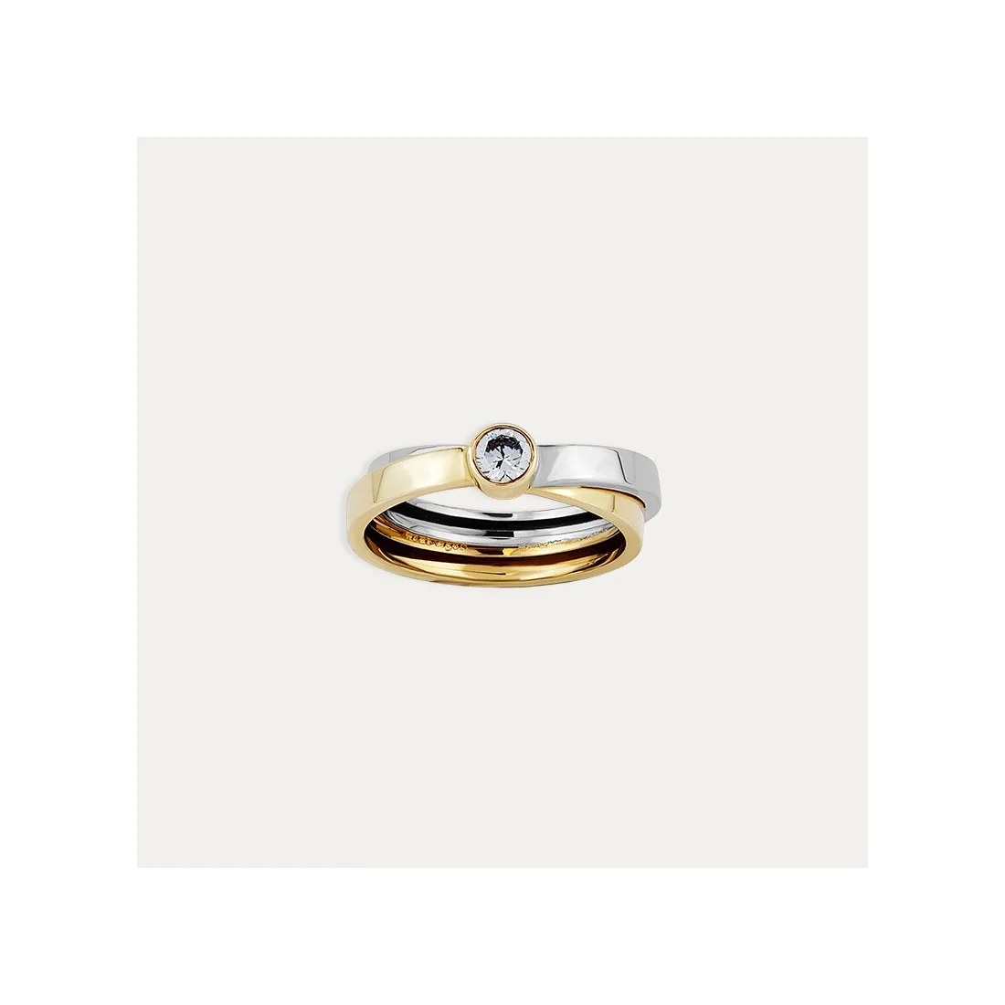 Sortija fabricada en Oro de 9 kilates bicolor con una circonita central engastada. Esta joya tiene un diseño asimétrico que juega con los dos colores del oro para envolver el dedo.