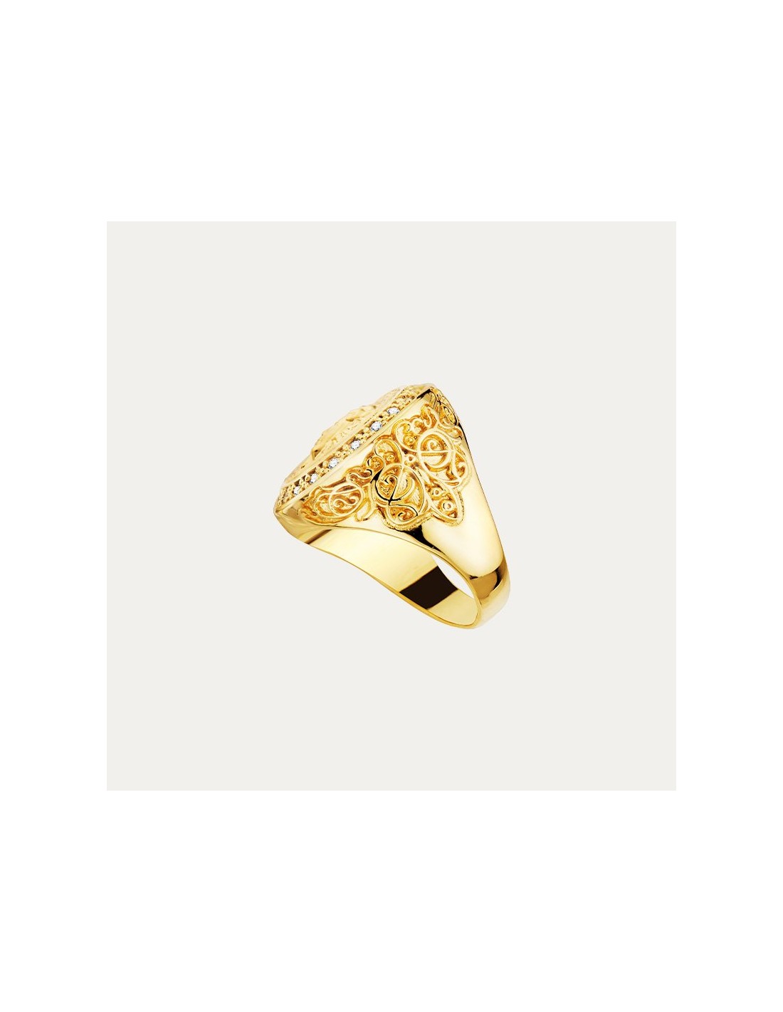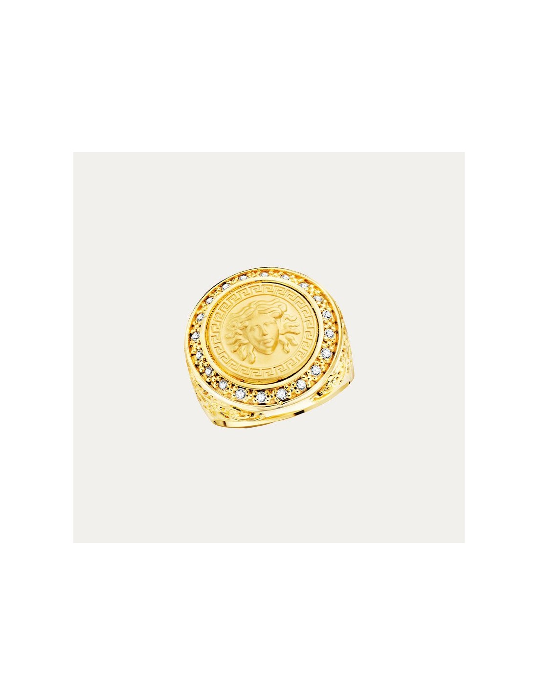 Sello en Oro de 18 kilates con cara de medusa y borde circular decorada con detalles en los laterales y circonitas.